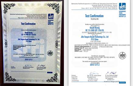 The basalt roving produced byJilin Tongxin Basalt Technology Co.Ltd was tested by “Saxon Textile Research Institute (STFI)”,the authority fiber inspection agency in Chemnitz of Germany, which including linear density, break strength, filament diameter and other items. The results showed that the various index and the products made byJilin Tongxin Basalt Technology Co.Ltd are in a leading leveling in the same industry of the world. STFI has issued a certificate of inspection to the company.(The results are documented in the test report:2016 1277.2.)The products of Jilin Tongxin Basalt Technology Co.Ltd has been recognized and praised by the Chemnitz University of Technology, CETEX Research Institutions are willing to cooperate with the company to develop basalt fiber and related composite products.