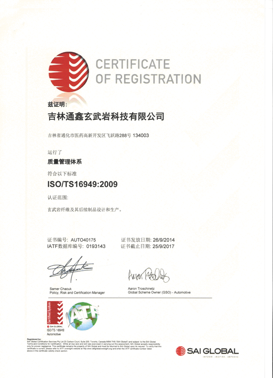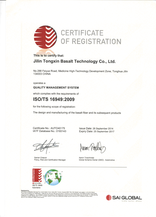 热烈庆祝吉林通鑫玄武岩科技有限公司于2014年9月26日通过ISO/TS16949:2009国际质量管理体系认证,成为玄武岩纤维行业内唯一通过ISO/TSI16949体系认证的企业。 - 上一篇:原吉林省机械厅厅长康立国等人协同中国兵器集团第五三所、第五五所研究人员来我公司调研